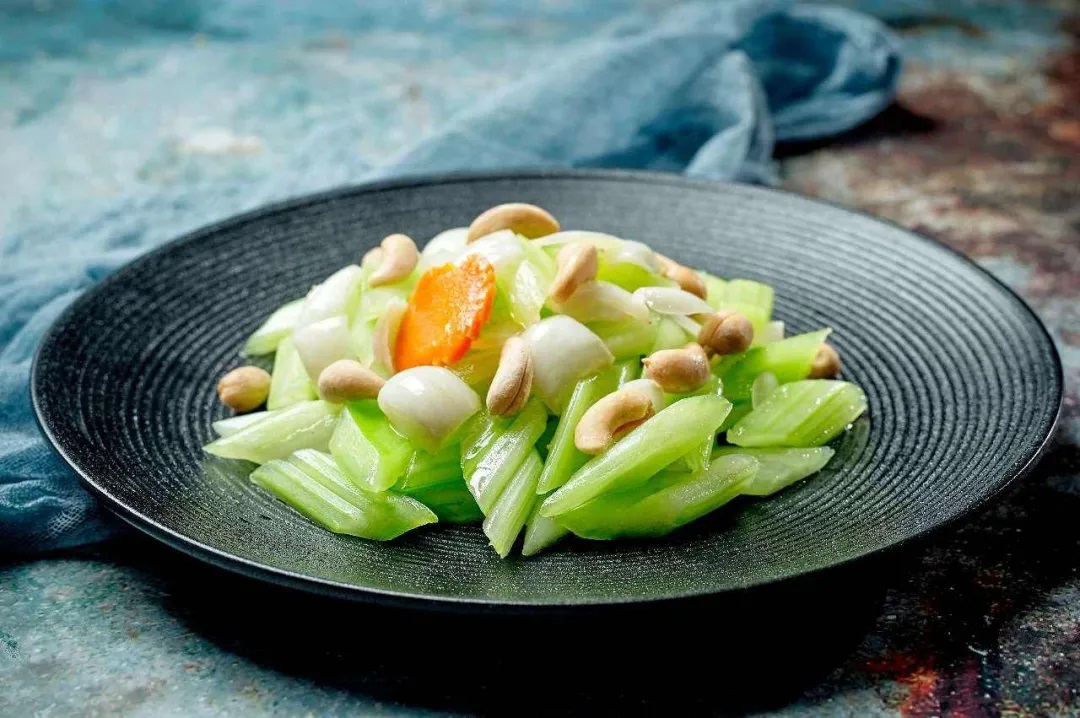 ③鍋燒熱下一點(diǎn)油,下西芹翻炒并加入腰果和鹽炒勻即可。