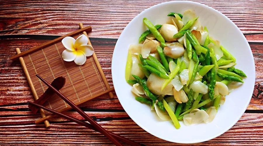 ③起鍋熱油,爆香姜絲,放入南瓜條翻炒,加少量水略煮,待南瓜八成熟時(shí),放入焯好的蘆筍、百合一起翻炒,用鹽調(diào)味,勾芡后即可。