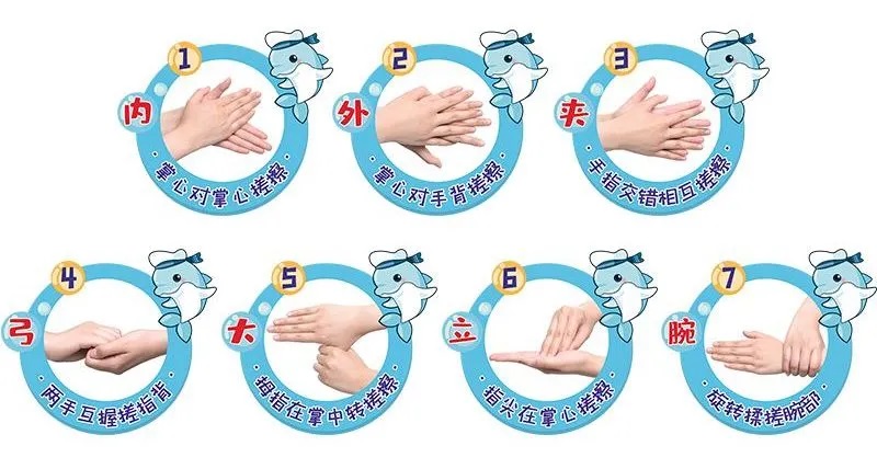 只搓揉手心,那就只有手心能達到消毒效果,所以要想完成手部的消毒,就必須嚴(yán)格按照“內(nèi)外夾弓大立腕”這七步洗手法來進行消毒,具體的操作步驟請看下圖。